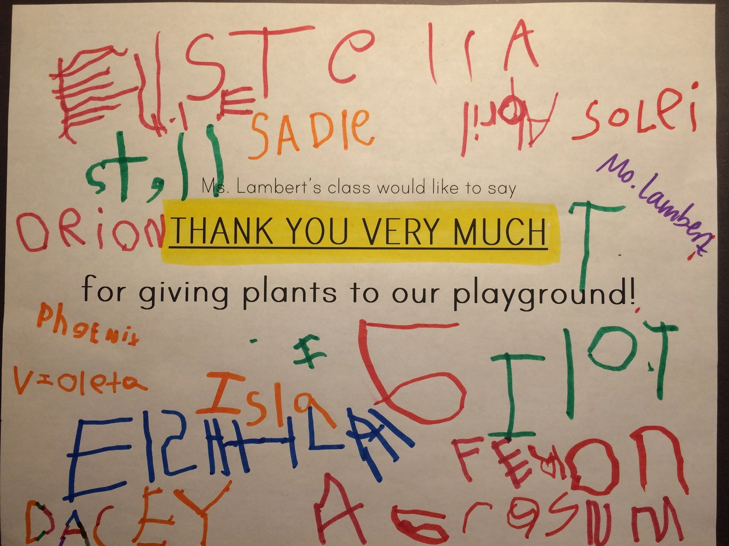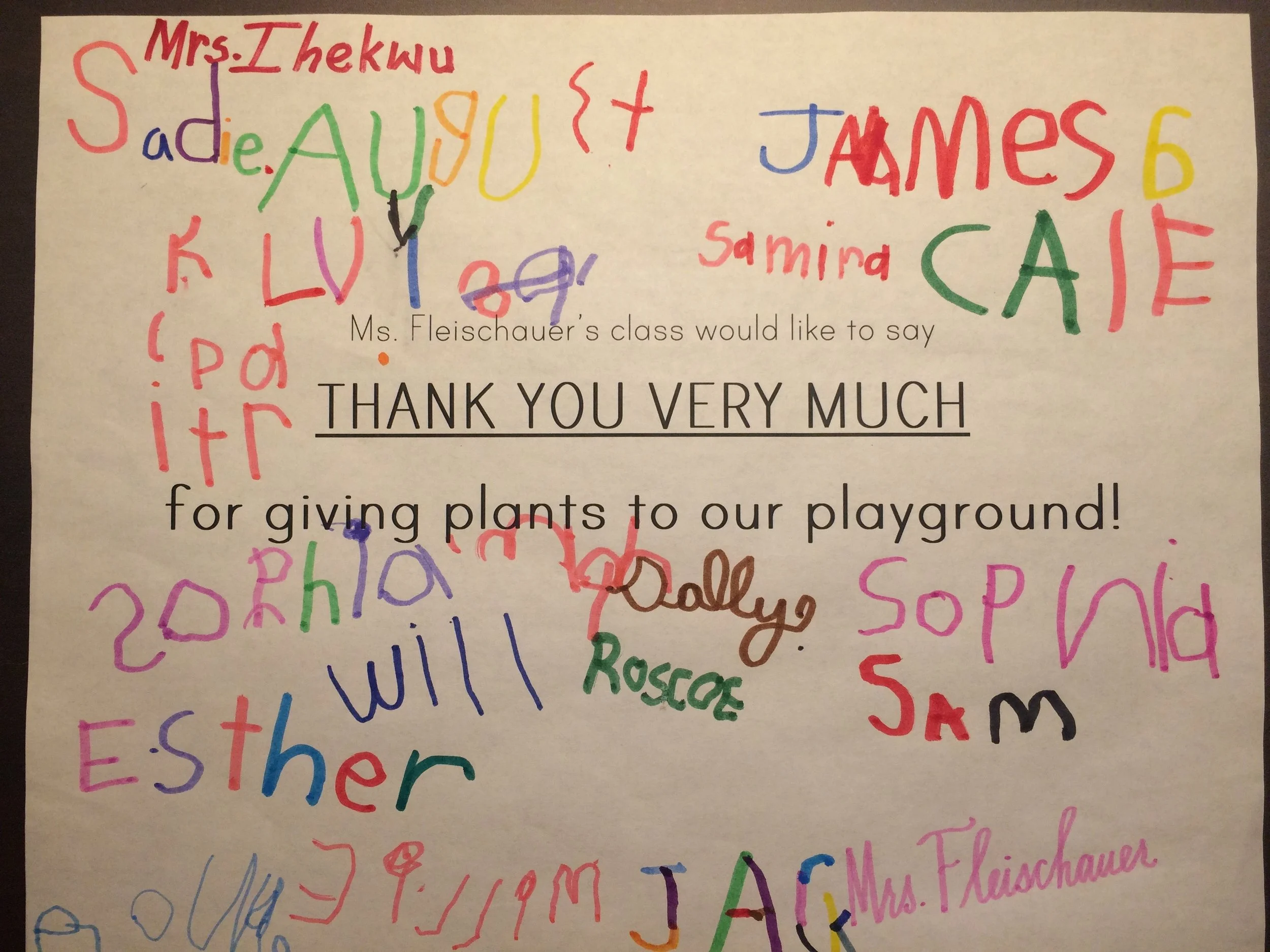 - A million thank yous to everyone who contributed to our Plant Drive! We received over $7,000 from alumni, neighbors, and parents, plus a generous donation of grasses from a local nursery. We also have a few more pledges waiting to arrive. We are so grateful for all of the support we received, and we’re excited to get our plants in the ground! Check out these very special thank yous from our primary classrooms: